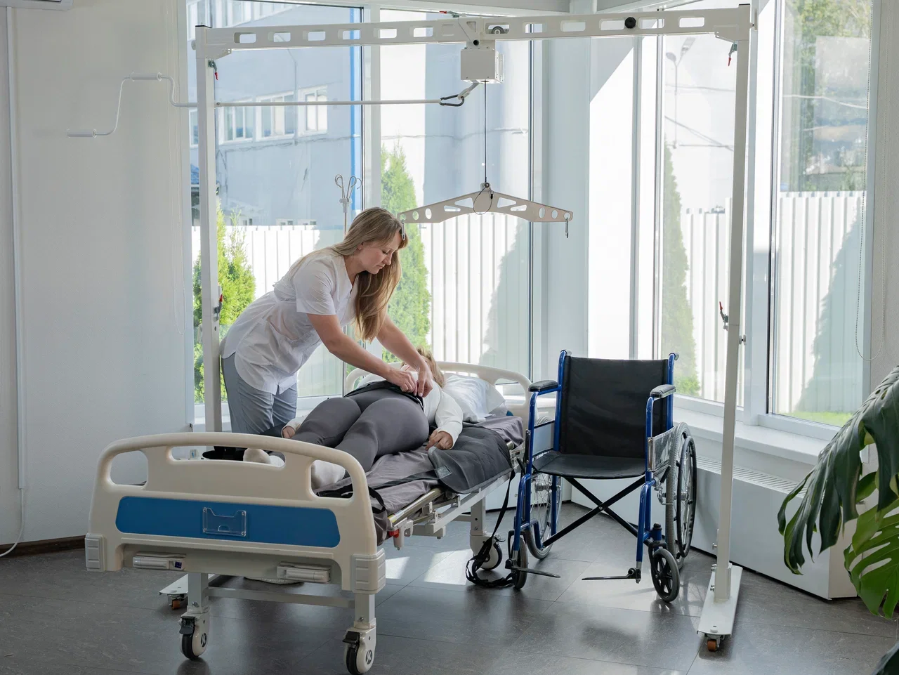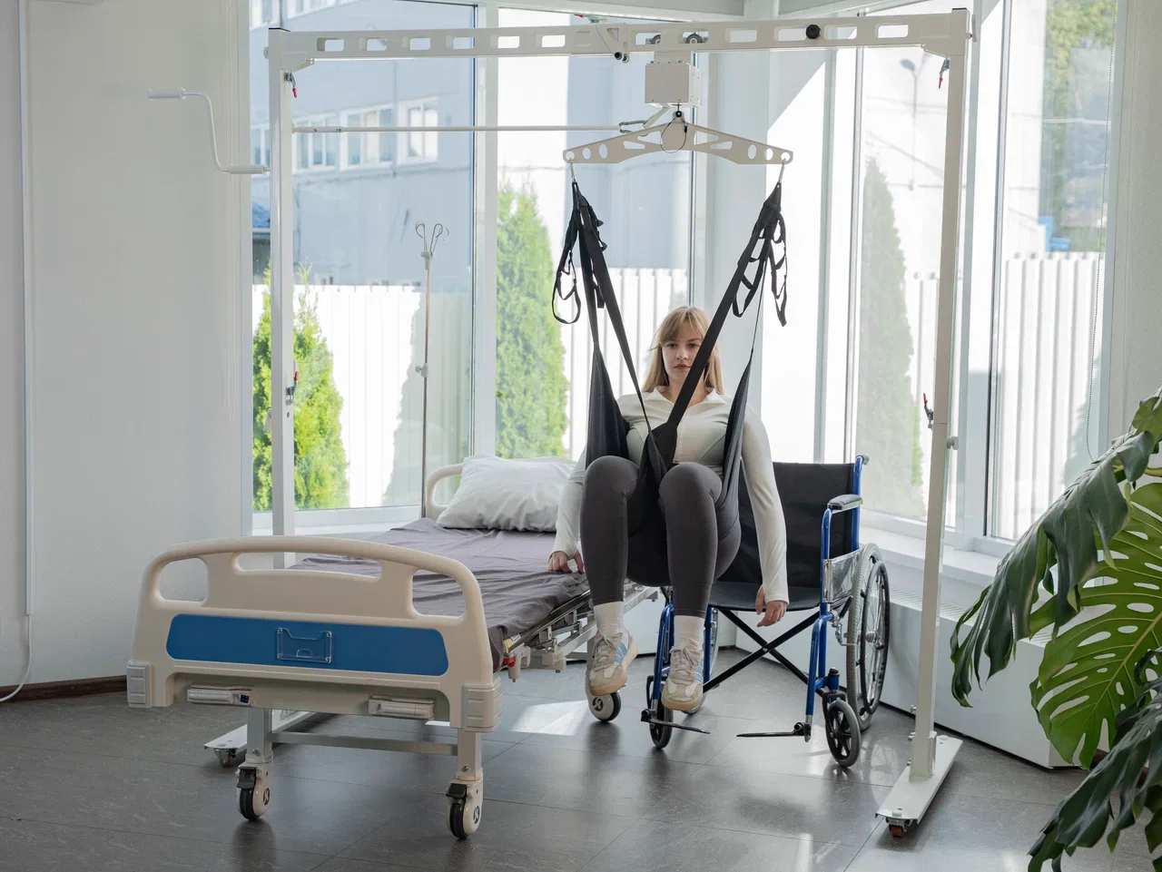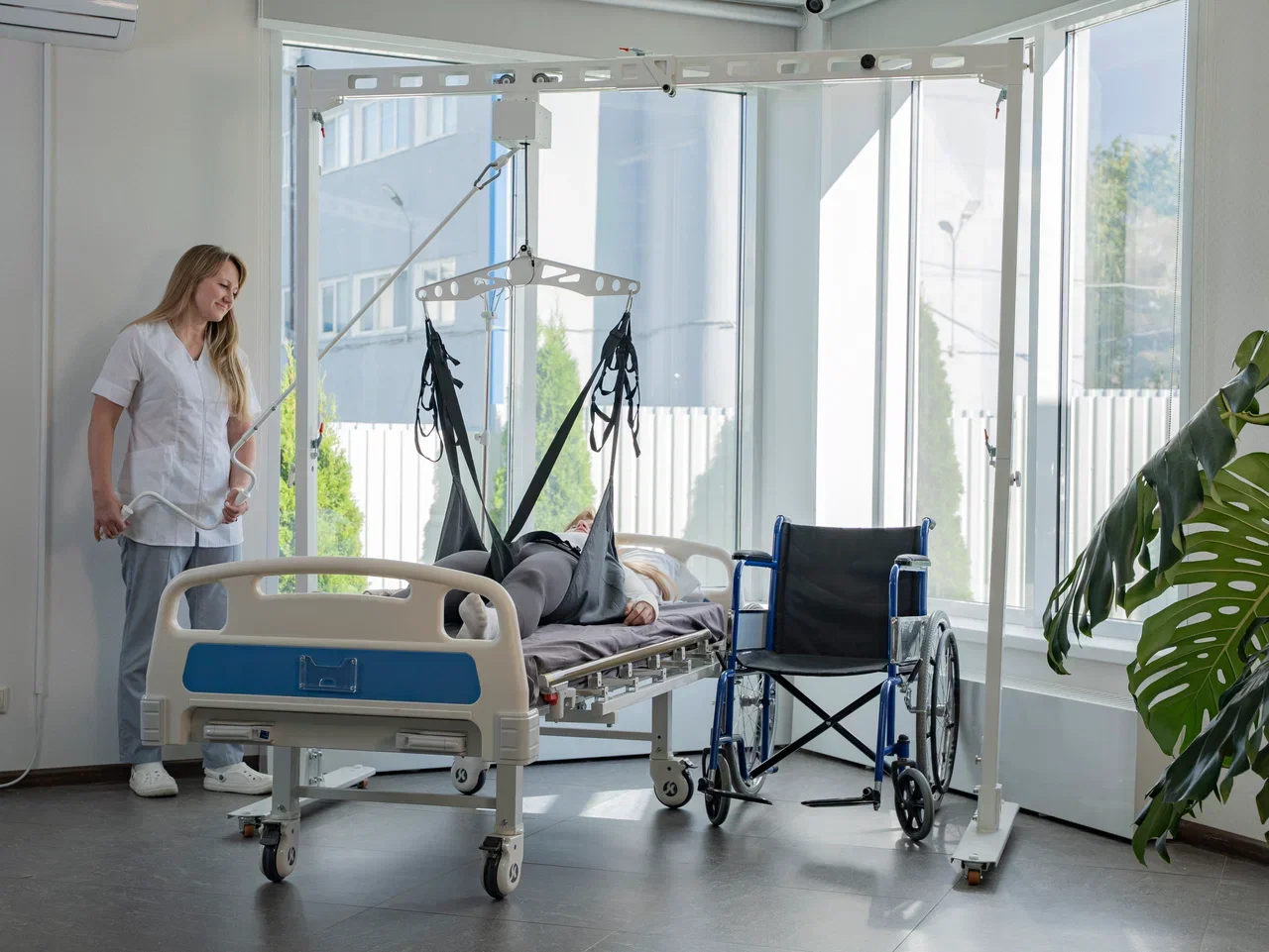 Подвес мобильный Ортофит-Ассистент — свободно стоящая П-образная стойка, которая устанавливается над кроватью и позволяет одному оператору выполнить подъём и пересадку пациента в коляску/кресло-туалет.