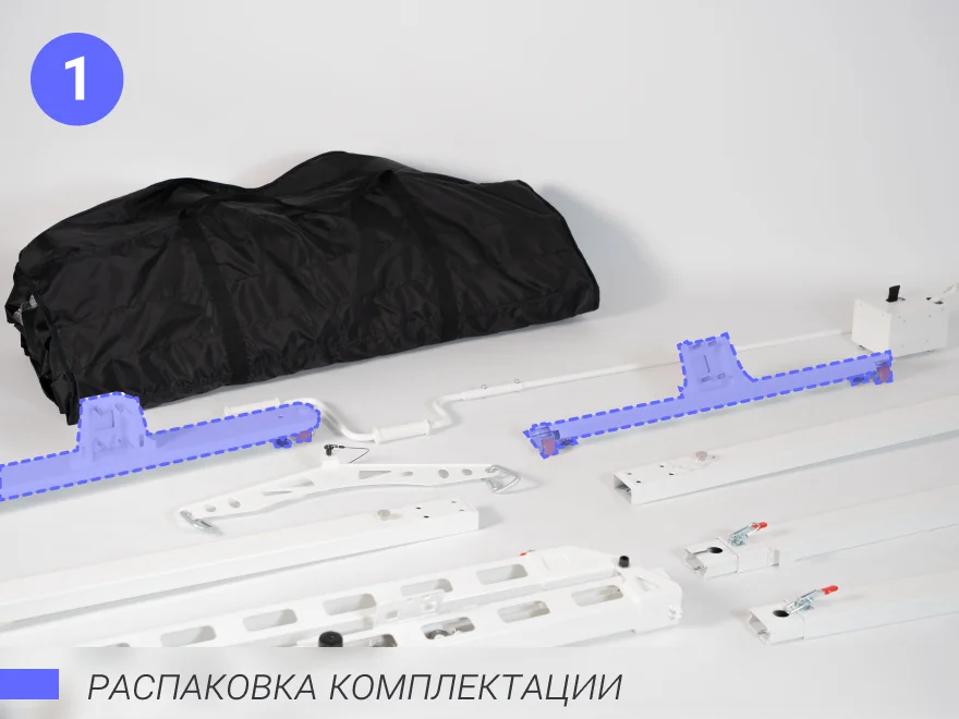 Конструкция полностью разборная: стойки и балка разбираются на компактные секции и укладываются в сумку-кофр.